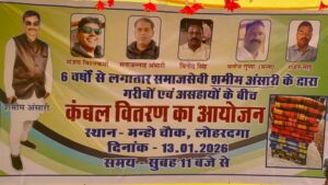 लोहरदगा:- मन्हों चौक पर मंगलवार को समाजसेवी शमीम अंसारी द्वारा जरूरतमंदों के बीच कंबल वितरण किया गया। इस दौरान ठंड से राहत पहुंचाने के उद्देश्य से कुल 300 कंबल बांटे गए। शमीम अंसारी बीते छह वर्षों से लगातार इस तरह का सामाजिक कार्य करते आ रहे हैं।